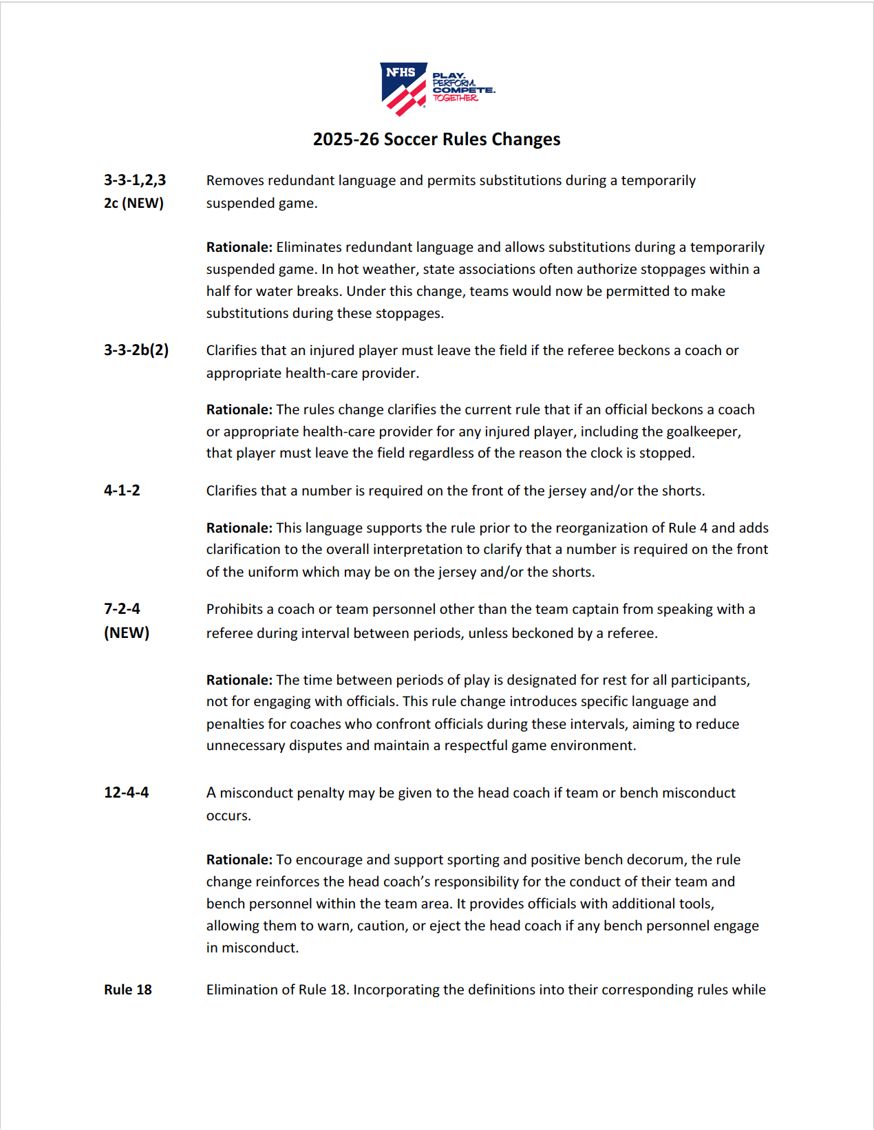 A quick look summary of the 2025-26 Soccer Rules Changes for the Spring ‘26 Season with their rationale. Editorial changes and points of emphasis are also included.